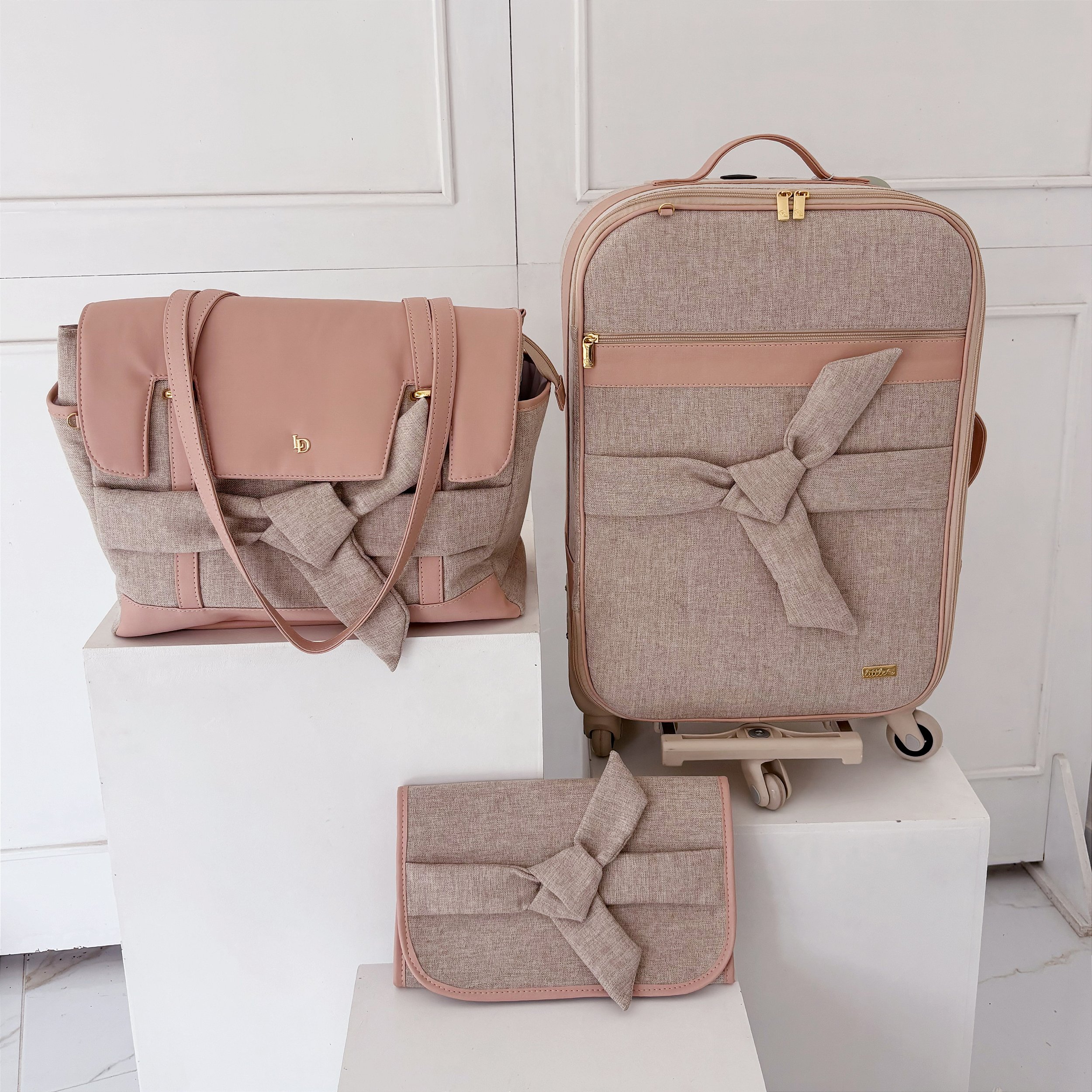 ESSE KIT É COMPOSTO POR UMA BOLSA DE PASSEIO BEATRIZ, UMA MALA E UM TROCADOR PERSONALIZADO, TODOS COM APLIQUE NÓ. ESTÁ EM PROMOÇÃO POIS A MALA POSSUI UMA MARCA DE COLA CONFORME A FOTO, MARCA PEQUENA, AS DEMAIS ENCONTRAM-SE EM PERFEITO ESTADO.